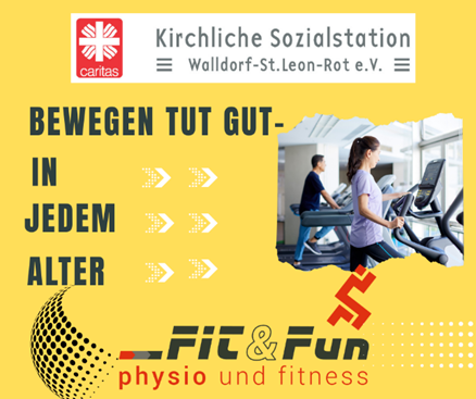 Die Kirchliche Sozialstation freut sich, eine neue Kooperation mit dem Gesundheitszentrum Fit & Fun in St. Leon-Rot bekanntzugeben. Ziel dieser Partnerschaft ist es, sowohl die eigenen Mitarbeiterinnen und Mitarbeiter im Rahmen des Betrieblichen Gesundheitsmanagements zu unterstützen als auch Klientinnen und Klienten ein attraktives, wohnortnahes Angebot für Physiotherapie, Rehabilitation und Wohlbefinden zu empfehlen.