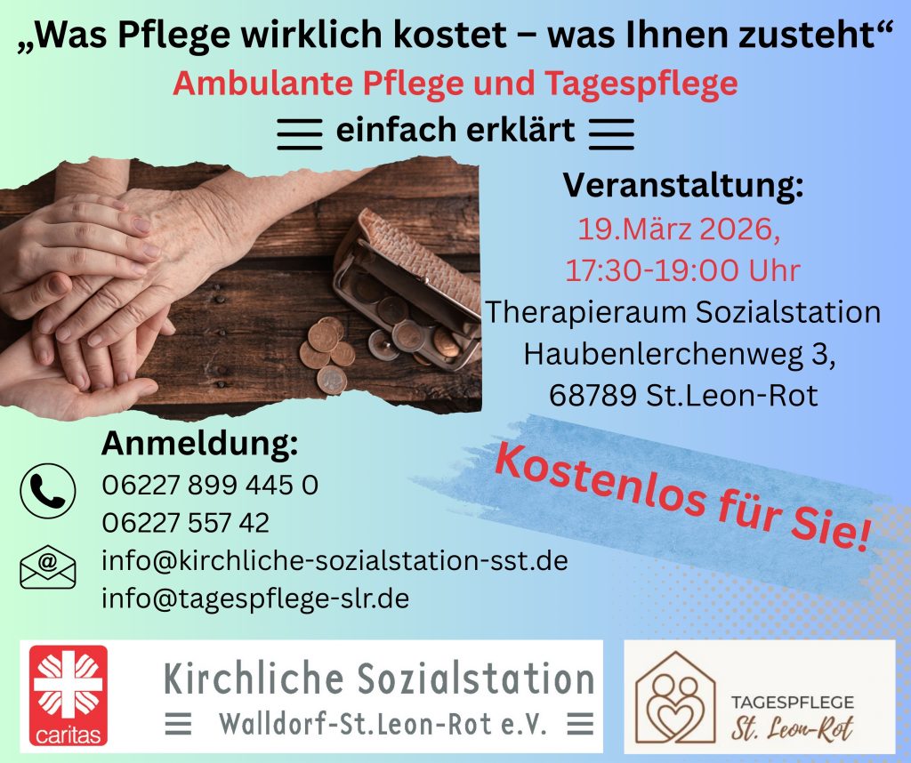 Die Kirchliche Sozialstation Walldorf-St. Leon-Rot e. V. lädt zusammen mit ihrem Kooperationspartner, der Tagespflege Frühwirth, alle Interessierten herzlich zu einer offenen Informationsveranstaltung ein.