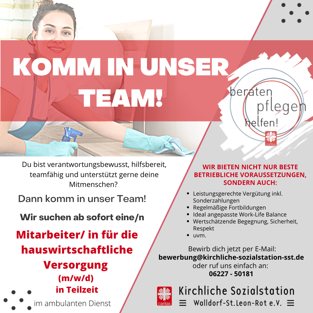 • Erfahrung im Bereich der hauswirtschaftlichen Versorgung ist wünschenswert, aber kein Muss!